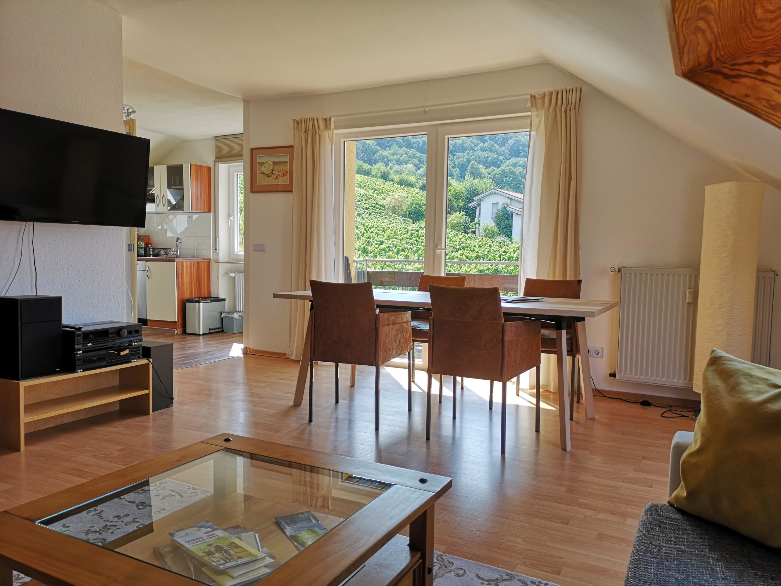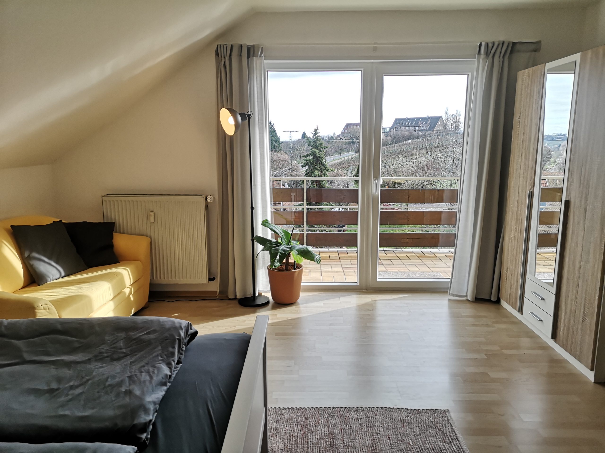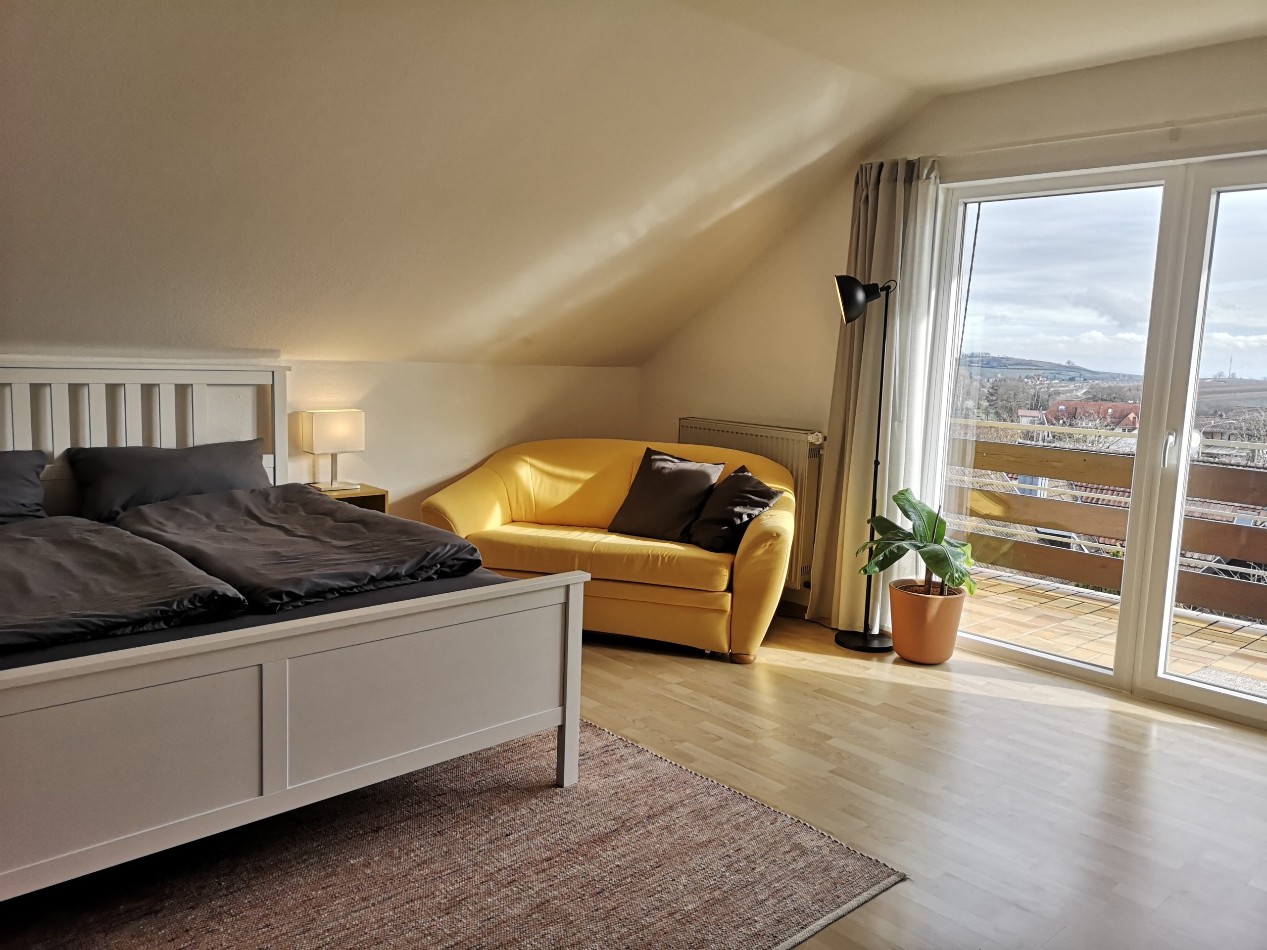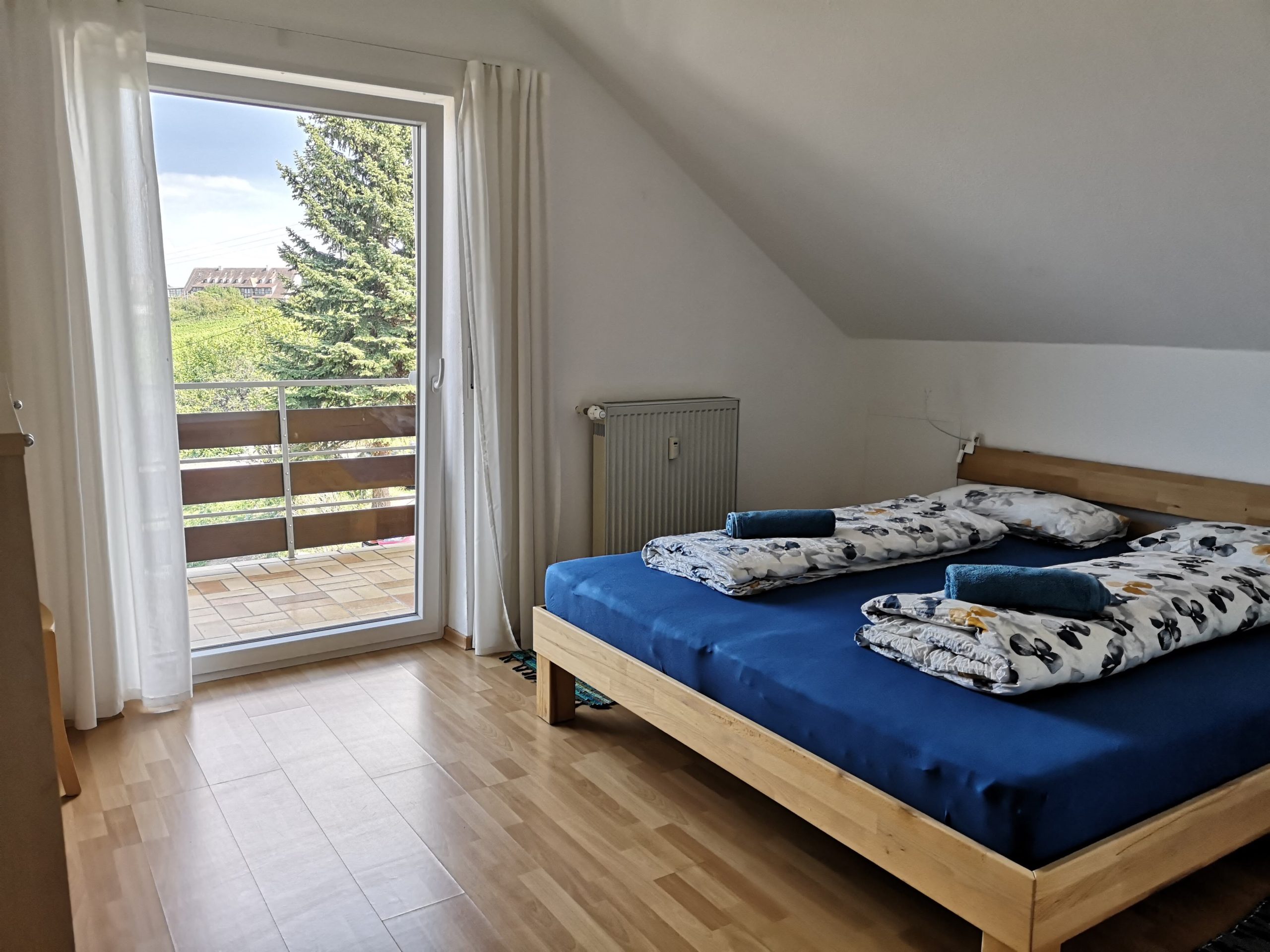 - Die 3-Zimmer-Wohnung Weinbergblick (85 qm) liegt ganz oben und hat 2 Balkone mit einer tollen Aussicht in die Rheinebene und die Weinberge. 2 Schlafzimmer für bis zu 5 Personen